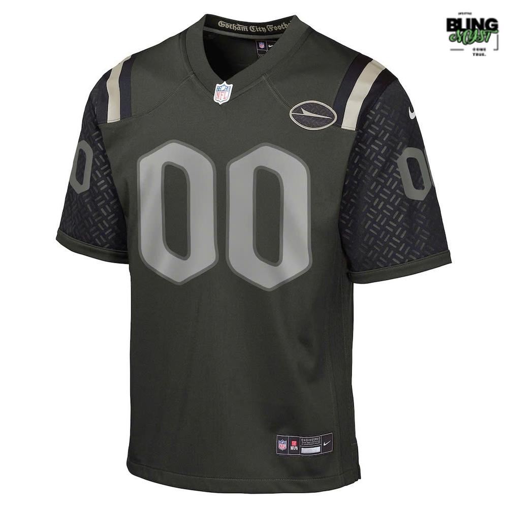 - The New York Jets 2025 Gotham City Football Jersey delivers a fierce, shadow-inspired aesthetic built around deep charcoal tones, steel-gray detailing, and bold, high-contrast numbering for a dramatic urban football look.