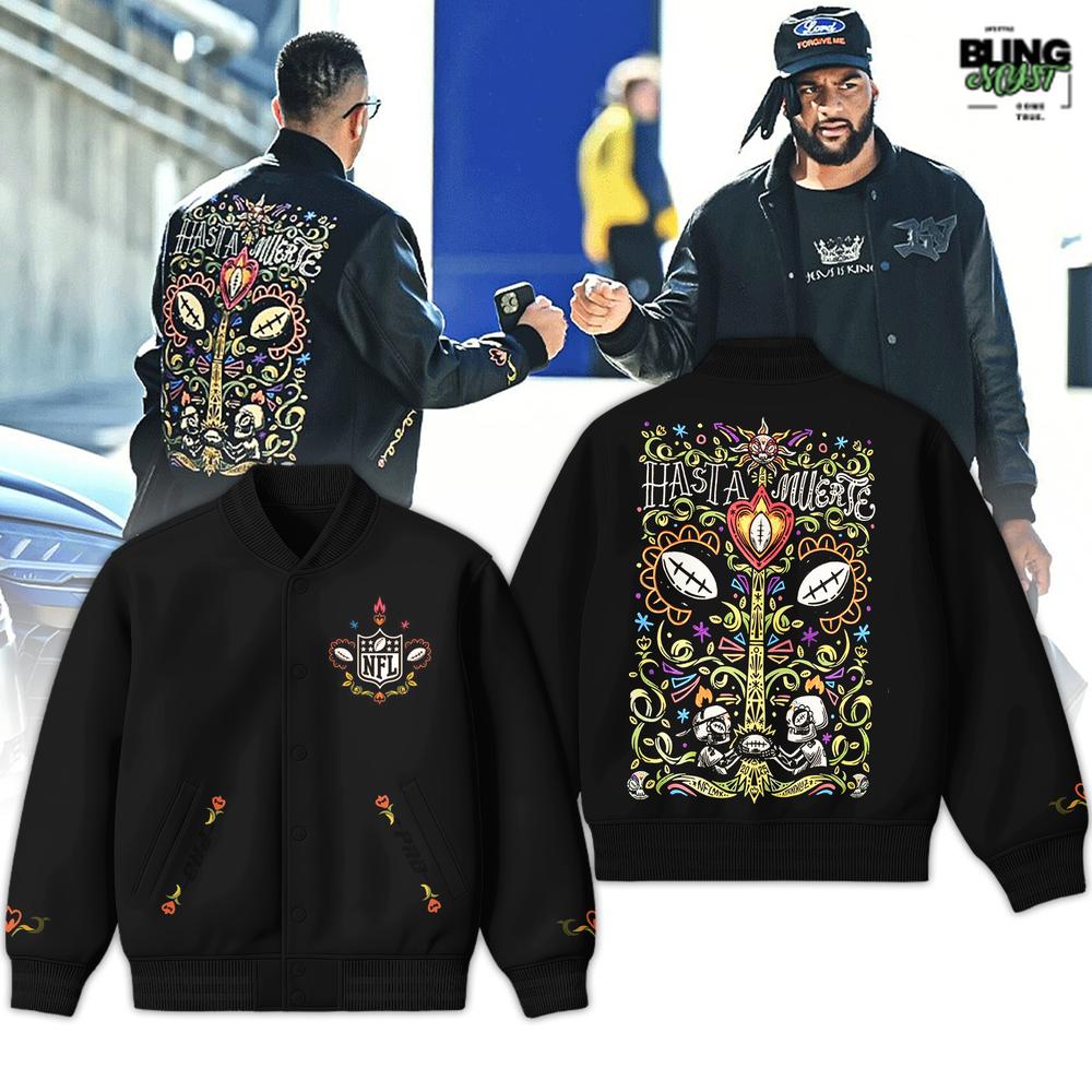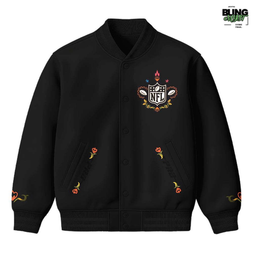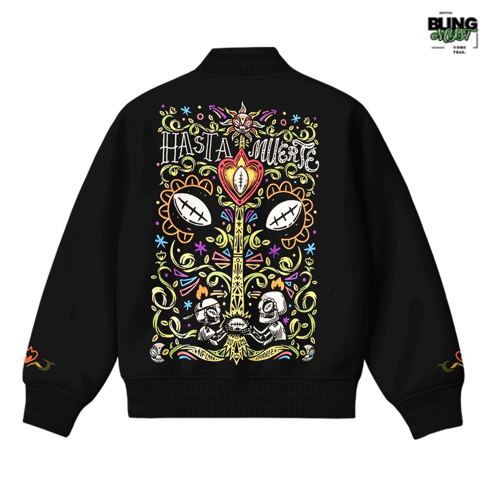 Show your passion for the game that never dies with the NFL Hasta La Muerte Heritage Varsity Jacket, a bold fusion of sport, culture, and artistic flair.