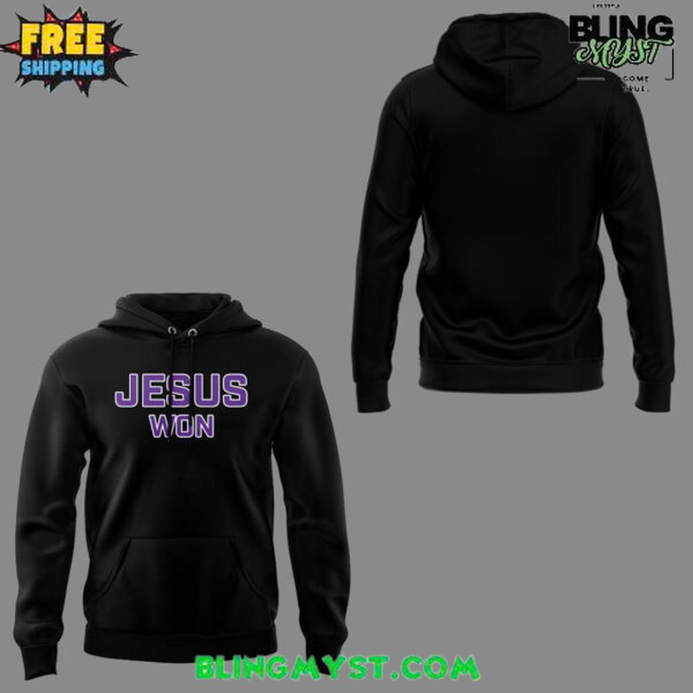 Clean and minimal black-on-black aesthetic with a striking purple “JESUS WON” front graphic that pops with purpose