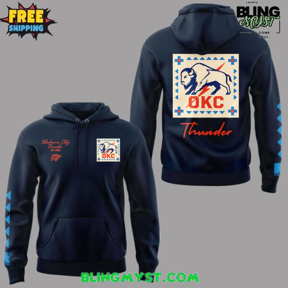 The navy base is a smart foundation: understated, versatile, and able to carry bold artwork without feeling chaotic. The front stays relatively restrained with a small chest graphicβan intentional move that preserves wearability and lets the back become the main canvas. Turn around, and the hoodie delivers its statement: a large, poster-like back graphic featuring OKC lettering, a stylized illustration, and decorative borders that feel hand-rendered rather than corporate. The red βThunderβ script adds a shot of energy and movement, giving the design an expressive finish that feels closer to streetwear collaboration than standard licensed merch.