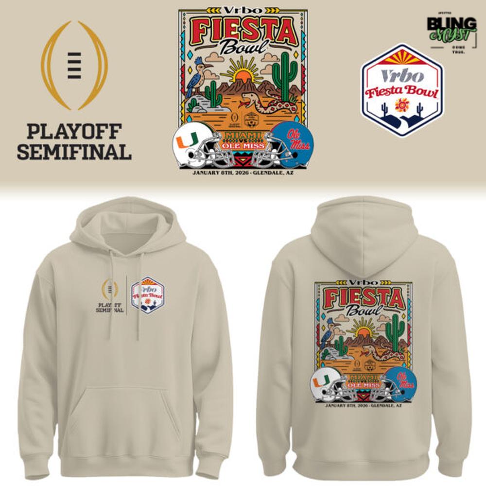 The Ole Miss Rebels x Miami Hurricanes Vrbo Fiesta Bowl 2026 Hoodie is designed as a wearable time capsule—less “generic bowl merch” and more commemorative poster translated into fabric. The choice of a muted sand/stone neutral hoodie base is deceptively smart: it feels premium, versatile, and lets the graphics carry the entire narrative without competing color noise. It also nudges the piece toward everyday streetwear, making it more likely to be worn long after the postseason ends.