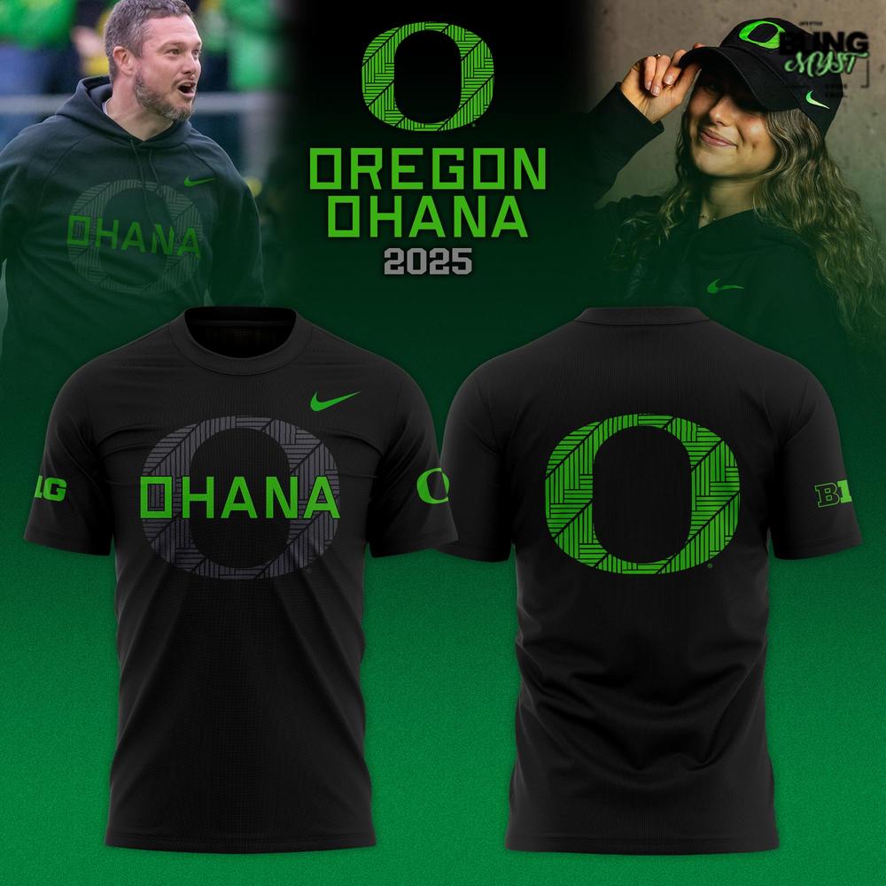 - This T-shirt features a bold front graphic combining the iconic Oregon “O” with bright green “OHANA” lettering for a look that’s both sleek and symbolic.
