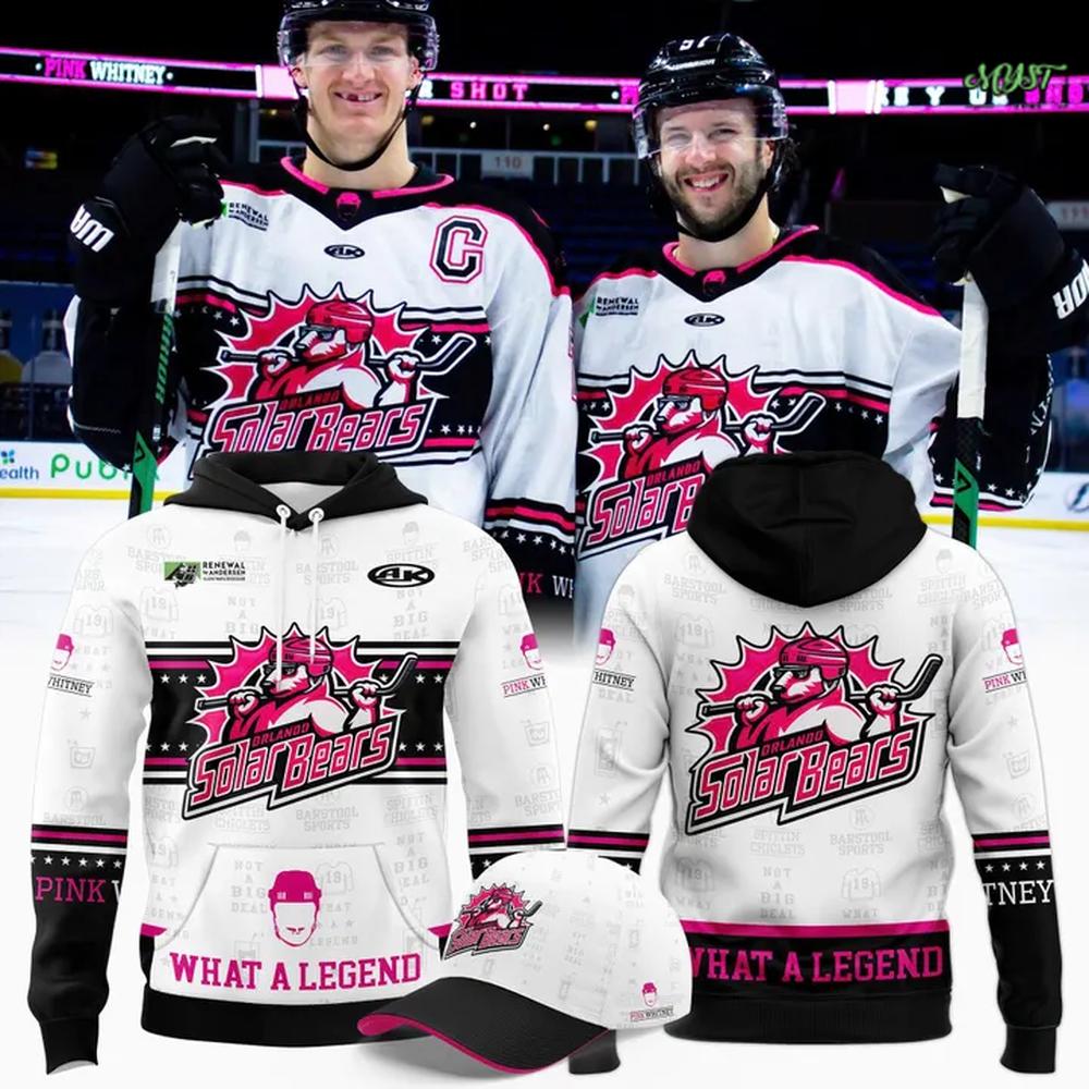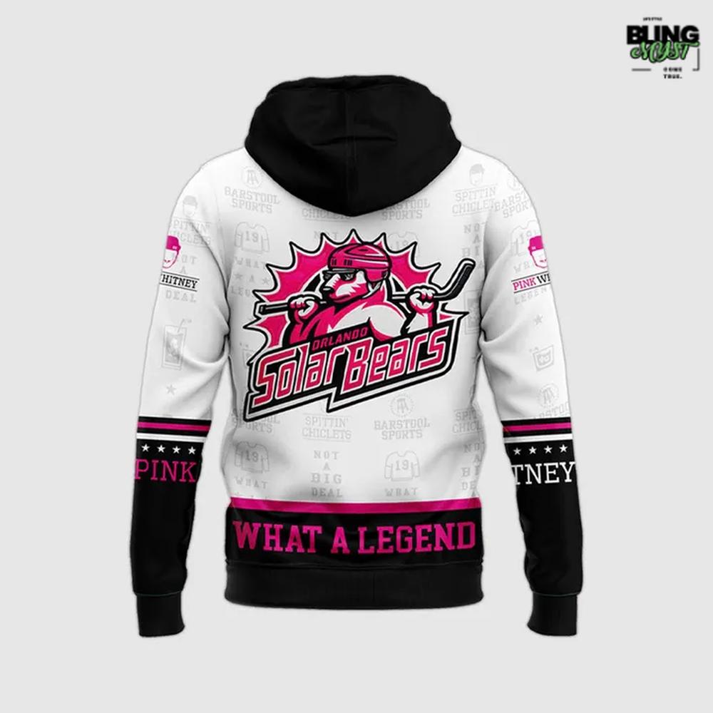The Orlando Solar Bears Pink Whitney Hoodie doesn’t just borrow from hockey aesthetics—it bottles the arena’s electricity and pours it straight into streetwear. The first thing that hits is the high-contrast palette: a crisp ice-white base sharpened by jet-black panels and jolted alive with hot pink accents. It’s a color story that feels both retro-sport and nightlife-ready, like a jersey redesigned for post-game celebration. This hoodie announces itself from across the room, yet stays surprisingly cohesive thanks to its disciplined striping and clean framing.