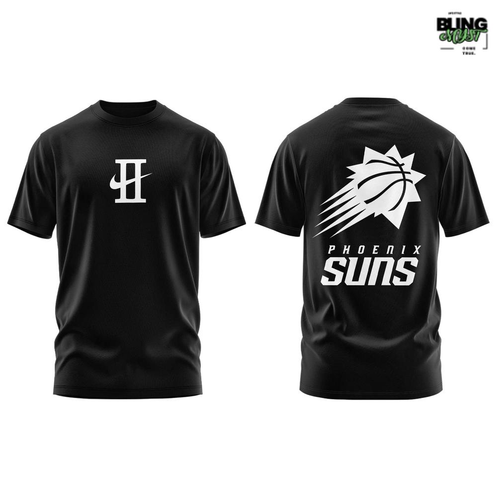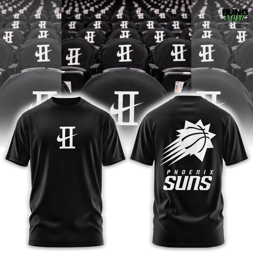 The Phoenix Suns Valley NBA Logo Chapter 2 Limited Edition T-Shirt is a study in restraint with intent—the kind of piece that doesn’t shout, but still feels decisive. Its foundation is pure black minimalism, a smart choice that makes the graphics feel sharper, cleaner, and more architectural. On the front, the compact “H” monogram (a chapter-style mark) sits like a quiet signature—understated, almost cryptic, inviting curiosity rather than demanding attention.