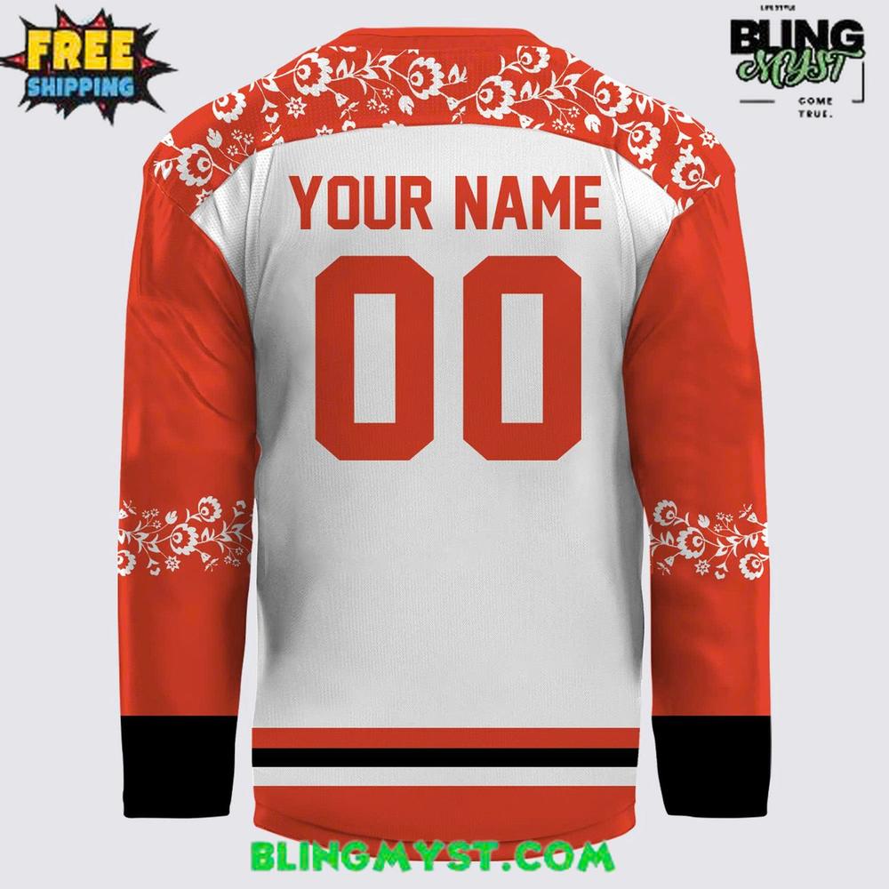 Designed with a bold white and orange color scheme, this jersey captures the energy of Polish pride while nodding to the Penguins’ fanbase.