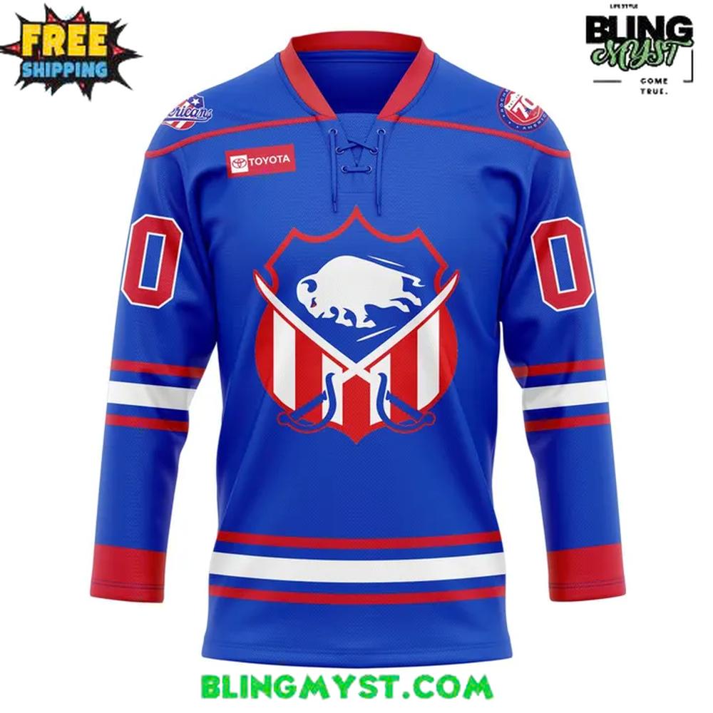The centerpiece crest is where the emotion lives. The iconic Americans shield with the charging buffalo reads as regional pride distilled into symbol—simple, strong, and unmistakable. It doesn’t rely on excessive detail; instead, it uses clean shapes and confident color blocking to evoke a time when sports branding was direct and fearless. The overall layout feels balanced and symmetrical, giving the jersey a true on-ice silhouette that collectors recognize immediately.