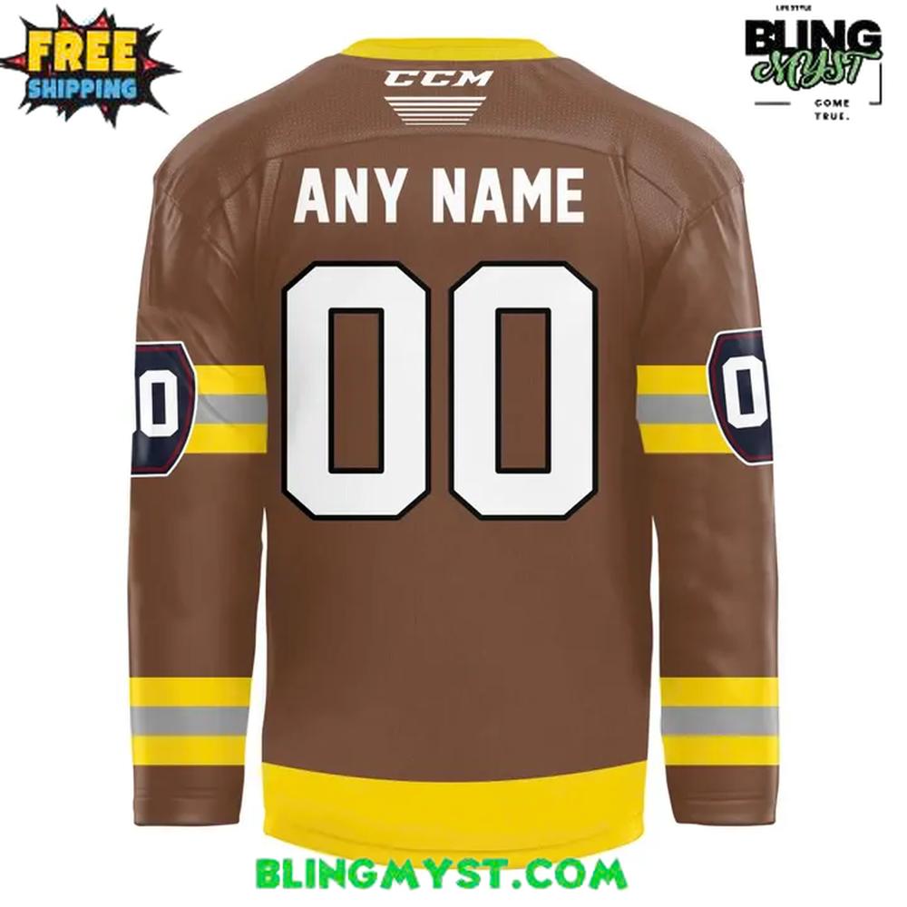 This striking hockey jersey features a distinctive tan or “bunker gear” brown base, meticulously designed to mimic the appearance of traditional firefighter turnout gear.