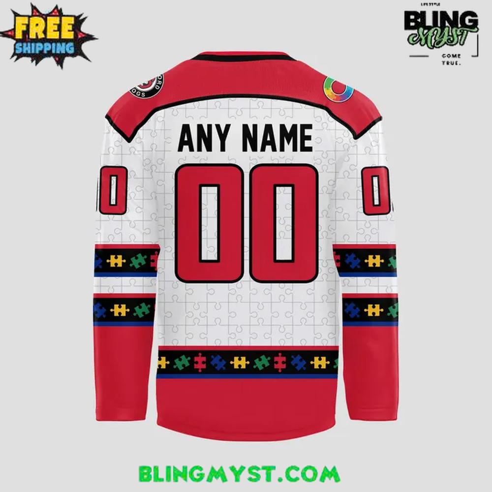 Design details add rhythm and individuality. The colorful puzzle-piece banding across the midsection and sleeves creates a strong graphic stripe effect, echoing traditional hockey striping while signaling the awareness theme. The back customizationβANY NAME with bold 00 numeralsβadds a personal, collectible finish, making it feel fan-specific rather than generic. High-contrast typography keeps it arena-legible, while patches and trim reinforce official jersey credibility. Overall, itβs a piece that combines team pride, purpose, and wearable sport-core style in one confident design.