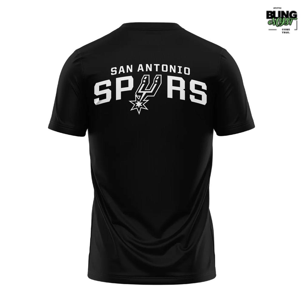 Classic black base paired with high-contrast action photography graphics on the front and crisp Spurs lettering on the back