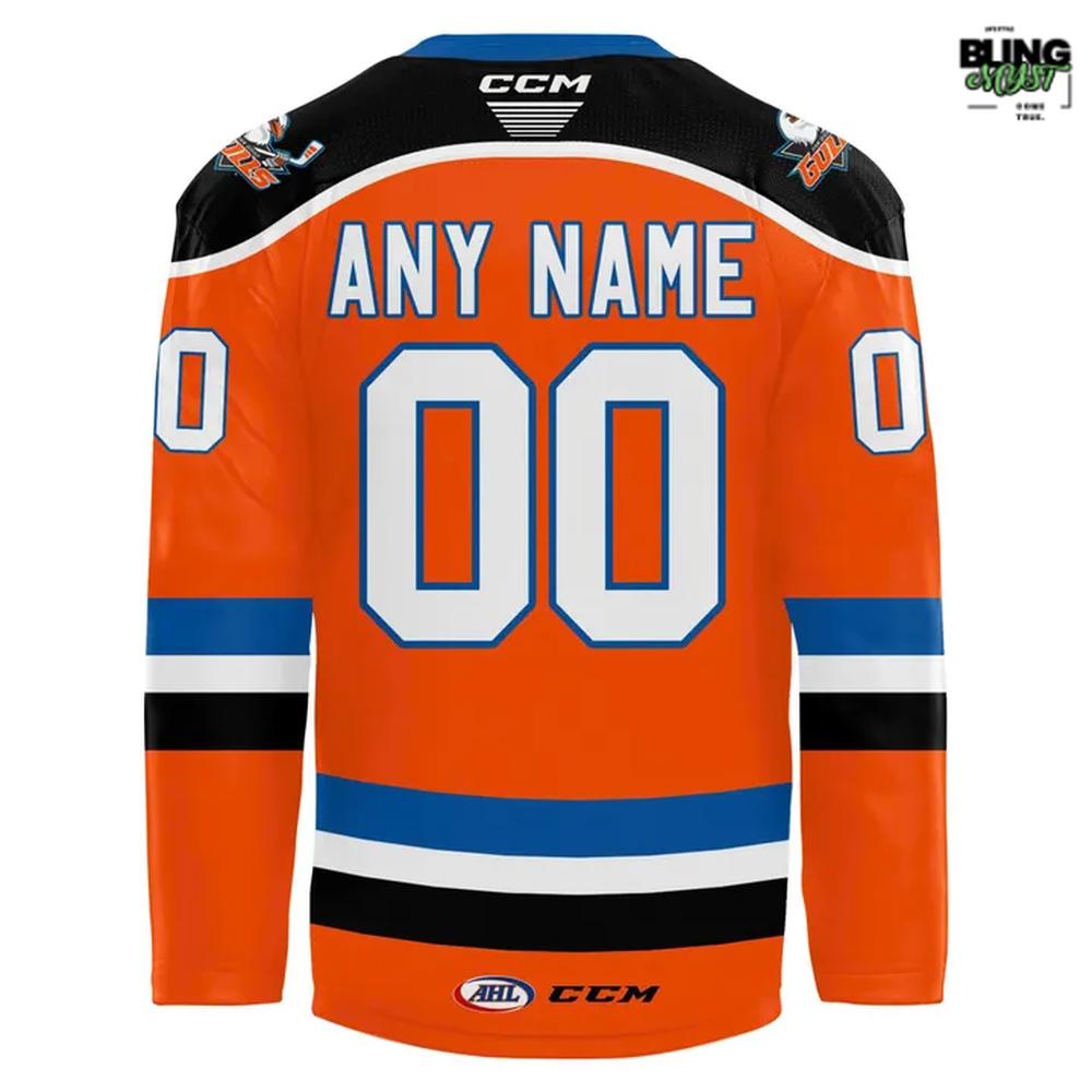 The San Diego Gulls 10 Year Anniversary Limited Hockey Jersey feels like a celebration built with intent, not just a date printed on fabric. Its first impact comes from the unapologetic orange field, a color that carries both California brightness and classic hockey aggression. Against that high-energy base, the black-and-white striping reads crisp and authoritative, giving the jersey a strong on-ice silhouette that looks official rather than novelty. It’s the kind of piece that doesn’t whisper “anniversary”—it wears the milestone like a banner.