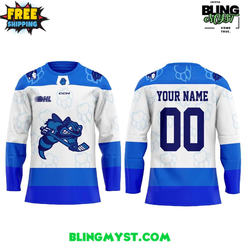 The Sarnia Sting “Lions Night At The Hive” Uniform Hockey Jersey as clean sport-luxe with a crisp ice-arena aesthetic. The dominant ice-white base gives it a fresh, premium look, while the saturated royal blue bands deliver strong team identity and a classic uniform silhouette. It feels modern, sharp, and highly wearable—more like a statement jersey you could style in real life than a one-night novelty. The overall vibe is polished, athletic, and photo-ready, perfect for fans who want something bold but not loud.