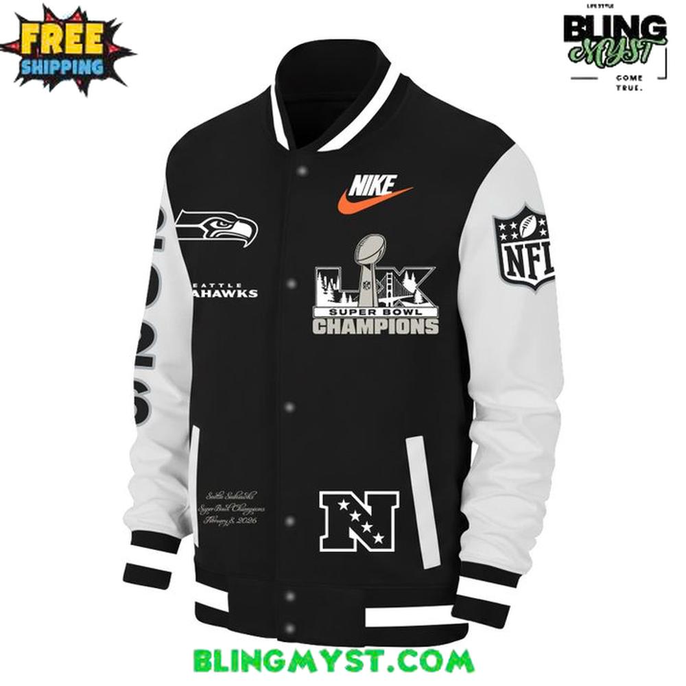 Celebrate a historic milestone in Seattle sports history with the Seattle Seahawks Super Bowl LX Champions Full-Snap Destroyer Nike Jacket. This elite piece of fan gear commemorates the 2026 championship victory, featuring premium wool-blend construction and high-definition embroidery. The sleek black and white colorway is accented with the iconic Seahawks logo on the chest and a bold “LX Super Bowl Champions” graphic, making it the ultimate statement piece for the 12s.