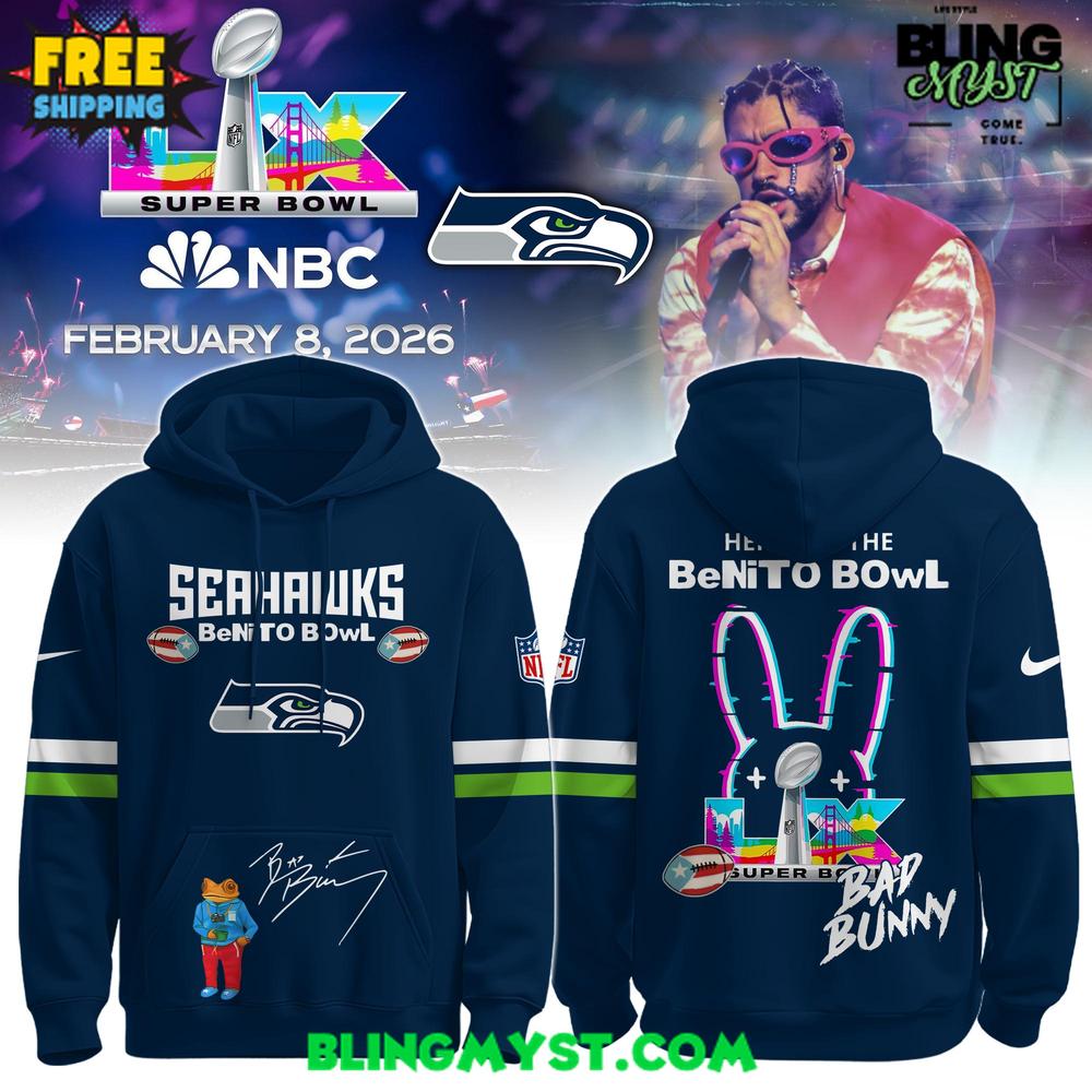 On the front, the SEAHAWKS wordmark and Super Bowl framing deliver legacy and occasion, while the added Bad Bunny references signal event energy—that sense of “this only happens once.” The signature-style graphic detail introduces a layer of collectible intimacy, like you’re wearing a limited artifact instead of a mass-produced hoodie. Then the back goes full statement: the bold “Benito Bowl” concept, paired with the neon bunny imagery, feels like a playful, surreal remix of championship iconography. It’s intentionally loud, but not chaotic—more concert-meets-stadium than random hype.