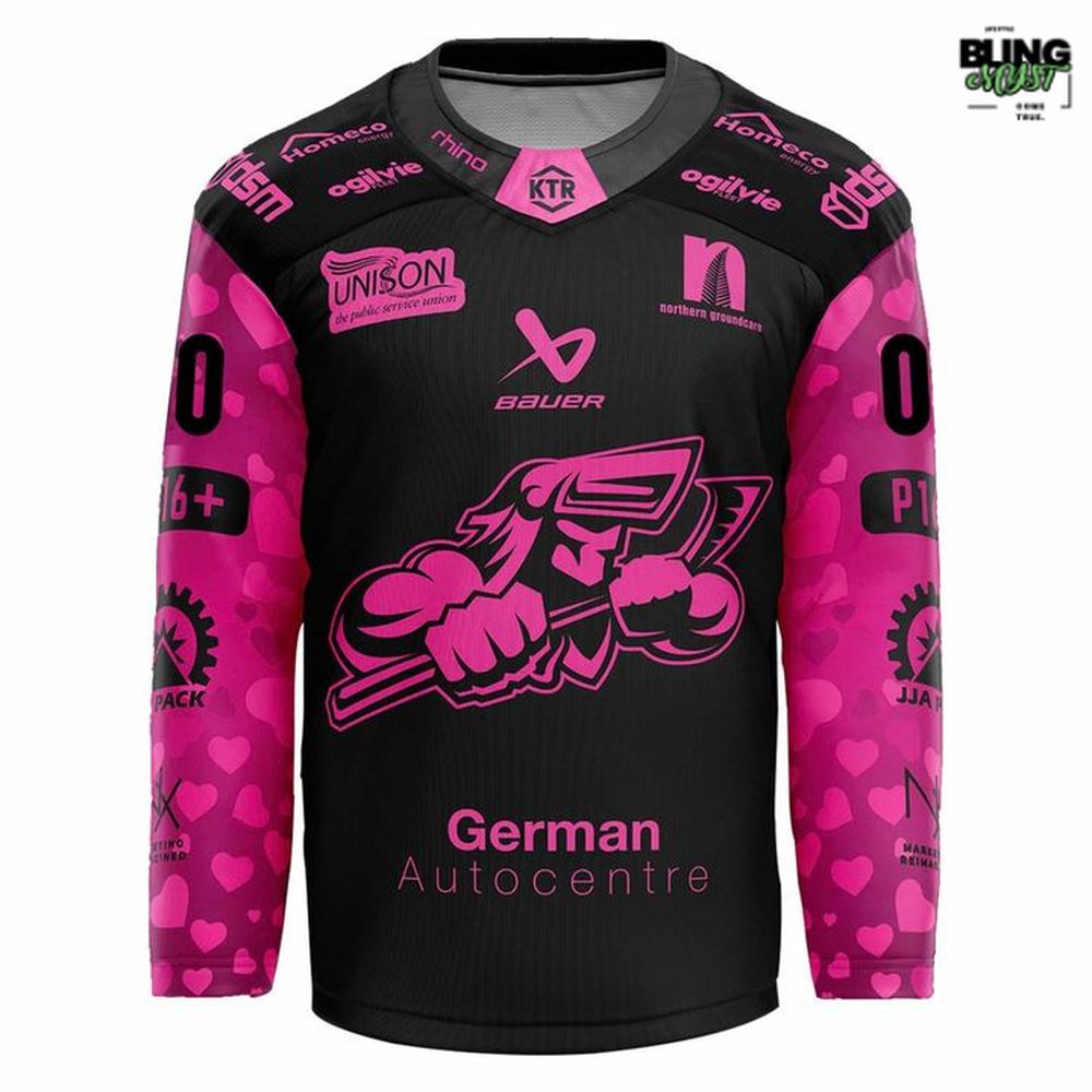 The Sheffield Steelers 2026 Valentines Hockey Jersey is a confident example of how theme-night sportswear can be both playful and hard-edged at the same time. Instead of treating Valentine’s as a soft, novelty afterthought, the jersey leans into an unapologetic pink-and-black contrast that feels more punk than precious. The saturated pink base hits with instant visual impact, while the black panels and aggressive linework keep it anchored in hockey’s natural language of intensity and attitude.