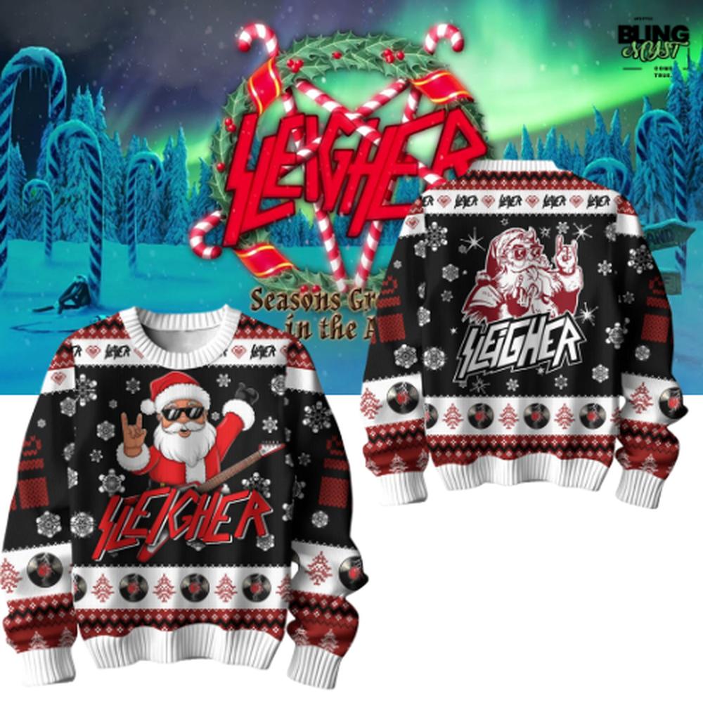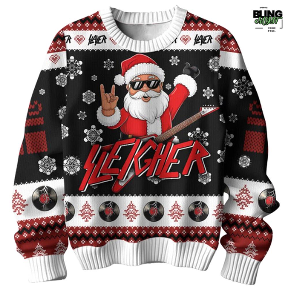 - Front design features a rock-star Santa throwing the horns, surrounded by snowflakes, classic knit patterns, and a striking โSleigherโ graphic inspired by iconic metal aesthetics.