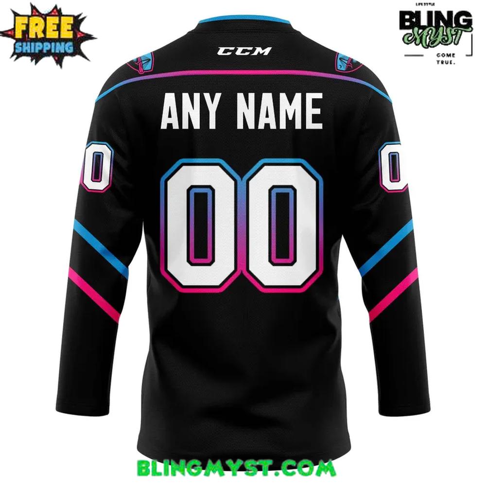 Bold black base, highlighted by striking pink and blue neon striping and a glowing Stingrays crest on the chest.