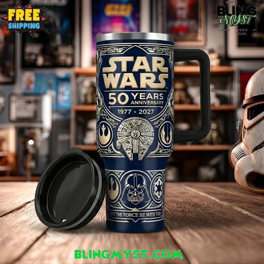 Celebrate half a century of the greatest space saga ever told with the Star Wars 50 Years Anniversary Stanley Tumbler Cup. This stunning collector’s item features a deep midnight blue finish adorned with intricate, 3D-sculpted silver and gold filigree that honors the 1977–2027 milestone. From the detailed Millennium Falcon centerpiece to the iconic masks of Darth Vader and stormtroopers, every inch of this vessel is designed to transport you to a galaxy far, far away.
