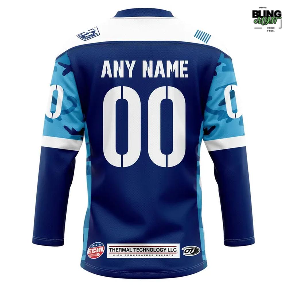 The Tahoe Knight Monsters Military Appreciation 2026 Hockey Jersey carries a rare kind of visual weight: it’s not just themed apparel, it’s a deliberate tribute expressed through color, symbol, and attitude. The foundation of deep navy immediately signals seriousness and respect, while the sharp bursts of teal and ice-blue add energy without undermining the jersey’s commemorative purpose. It feels intentionally restrained—patriotic without becoming loud.