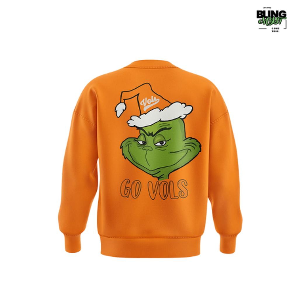 - The back features a festive Grinch portrait in a Vols Santa hat with βGO VOLSβ typography, tying the whole holiday-inspired theme together.