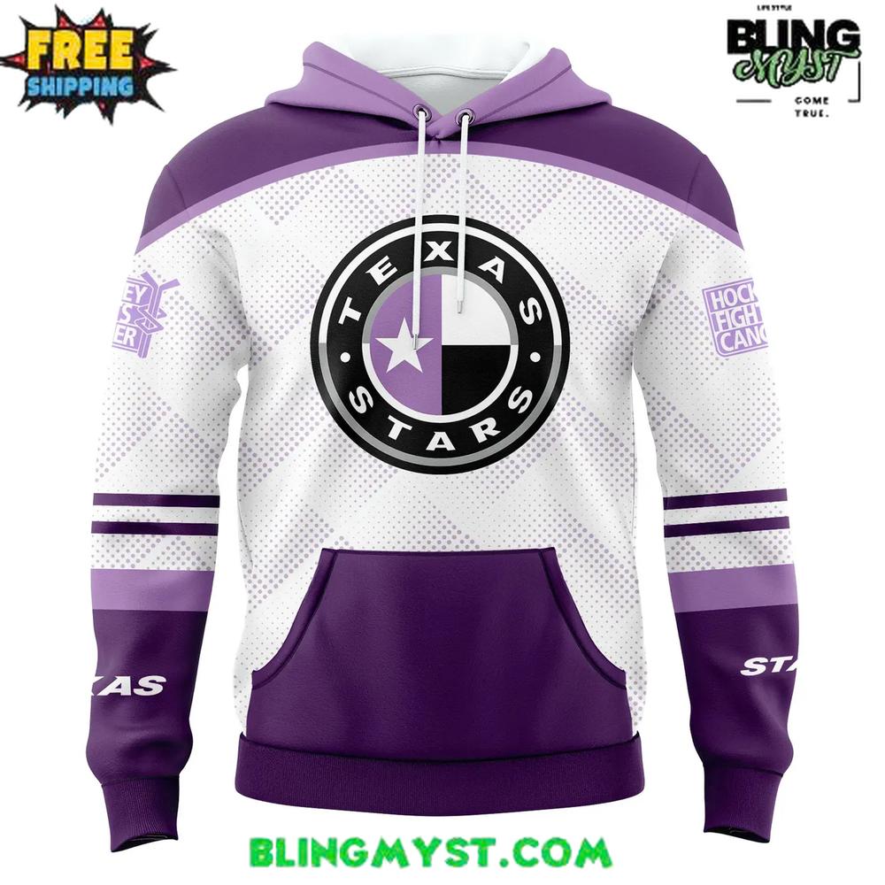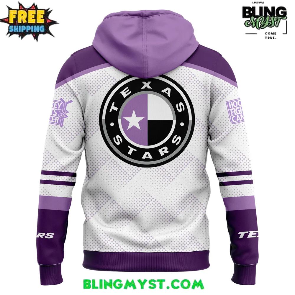 The Texas Stars Hockey Fight Cancer Special Edition Hoodie makes a bold visual statement with its clean white base, rich purple accents, and impactful event-inspired graphics.