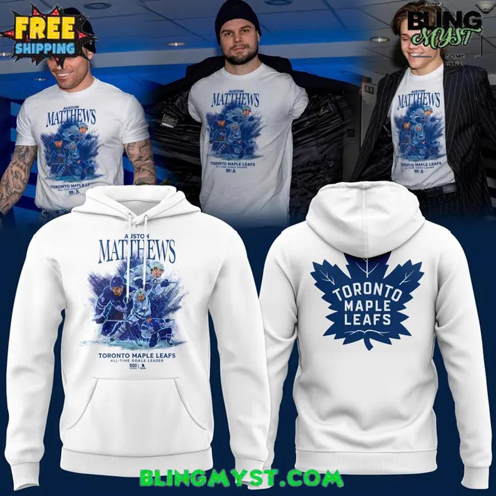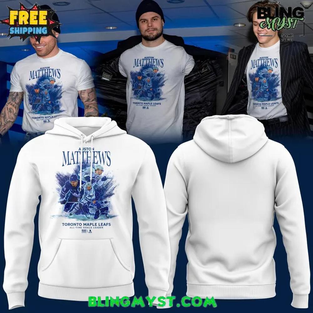 The Toronto Maple Leafs x Auston Matthews Special Edition Hoodie reads like a piece of fanwear that wants to be taken seriously—more art print than arena souvenir. The choice of a clean white base is immediately significant: it creates a bright, modern canvas that feels premium and intentional, while allowing the Leafs’ signature blue to carry the emotional weight. White also amplifies the hoodie’s everyday versatility, making it feel at home in streetwear rotation, not just game-night rotation.