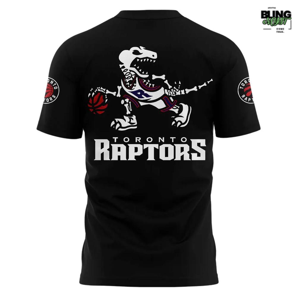 • Back showcases the iconic Raptors skeleton dinosaur dribbling under the lights — a hauntingly cool twist on the classic logo.