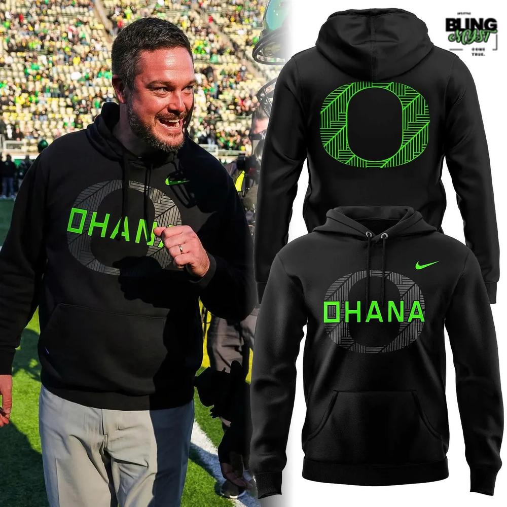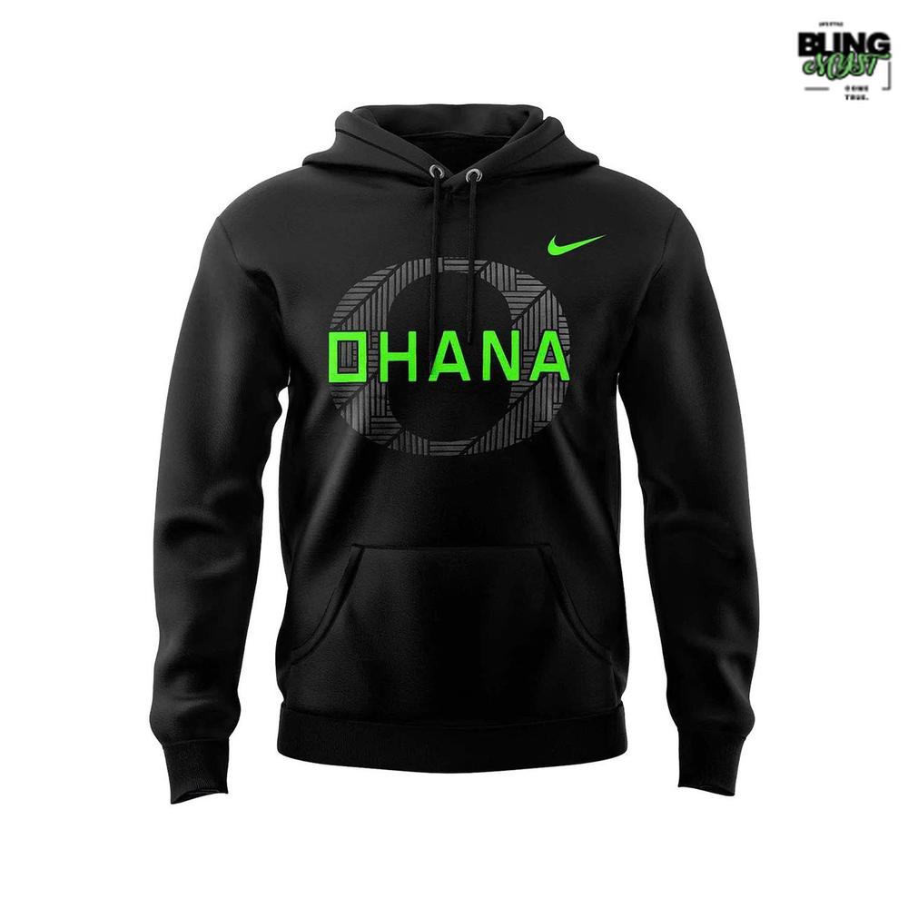 - The Unisex Nike Black Oregon Ducks Ohana 2025 Hoodie delivers a sleek look with a bold green βOHANAβ graphic centered inside a textured circular design.