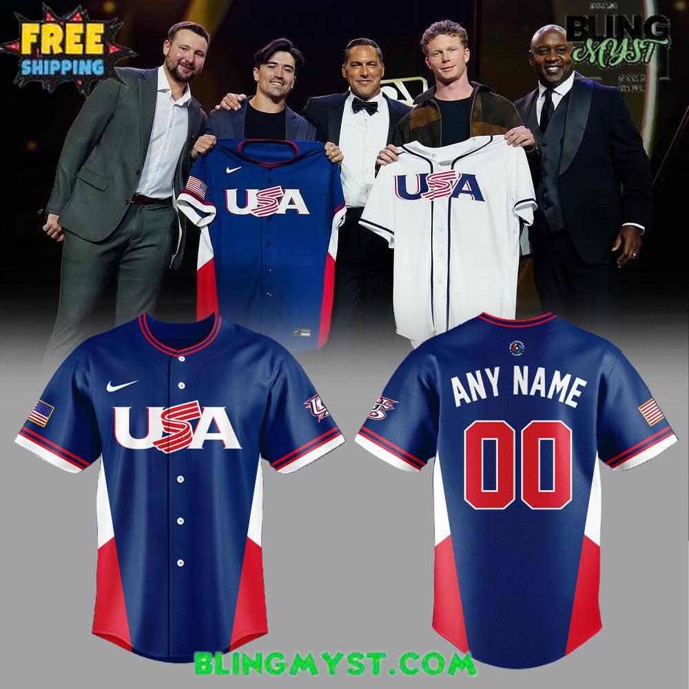 The navy-and-red USA wordmark across the chest stands out with crisp detailing, delivering a modern yet timeless international baseball aesthetic.