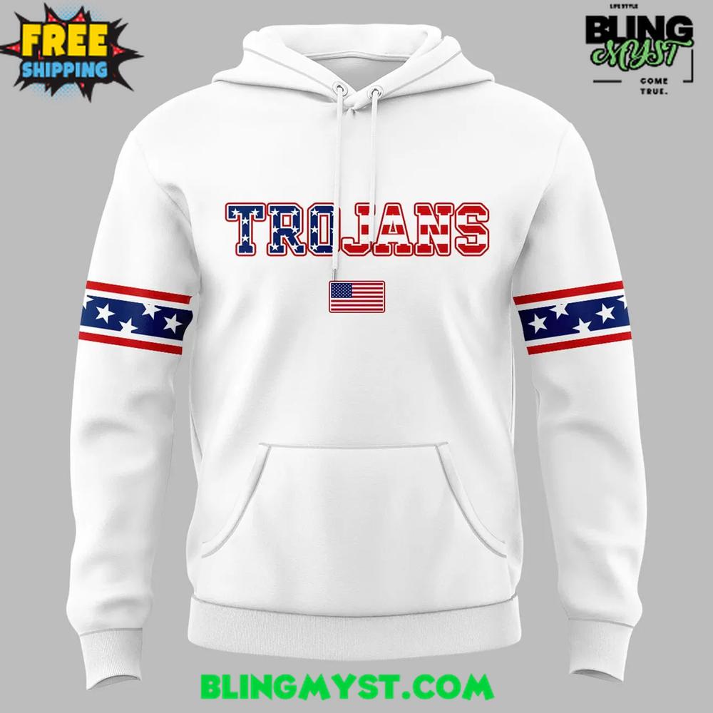 Front displays the bold Trojans wordmark filled with patriotic stars and stripes, plus a small U.S. flag for added tribute.