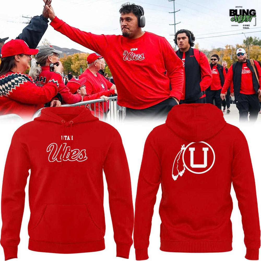 Features a vibrant red color palette with the signature “Utes” script on the front and the classic feathered U logo on the back.