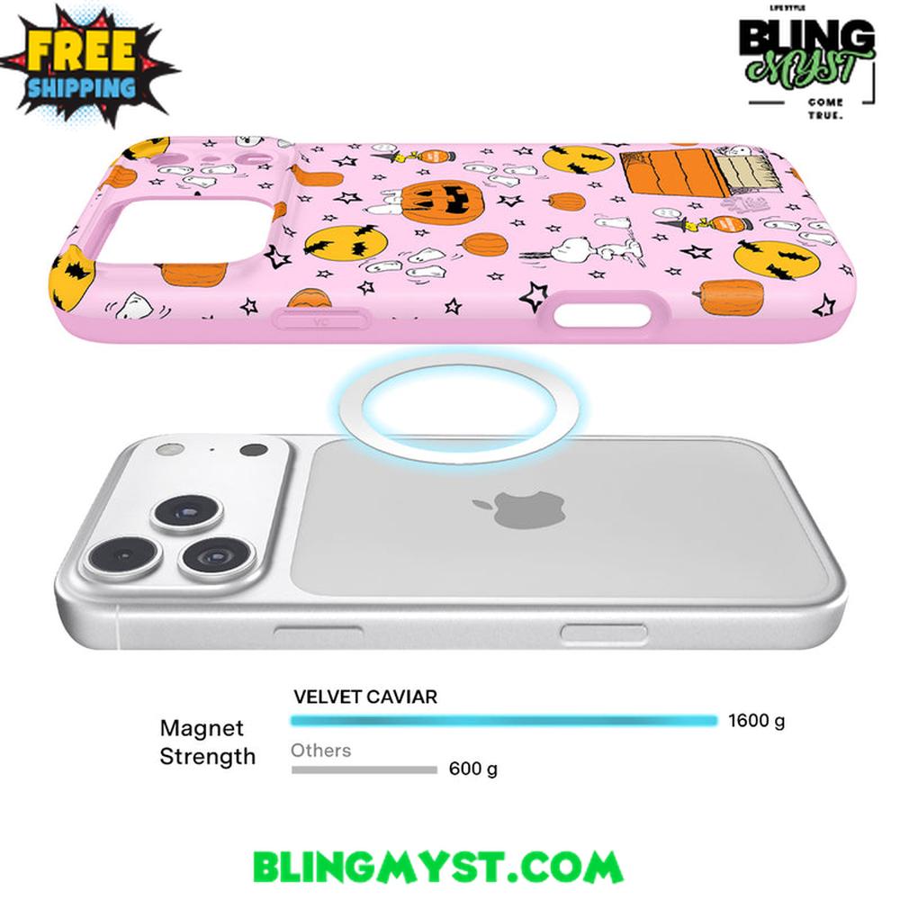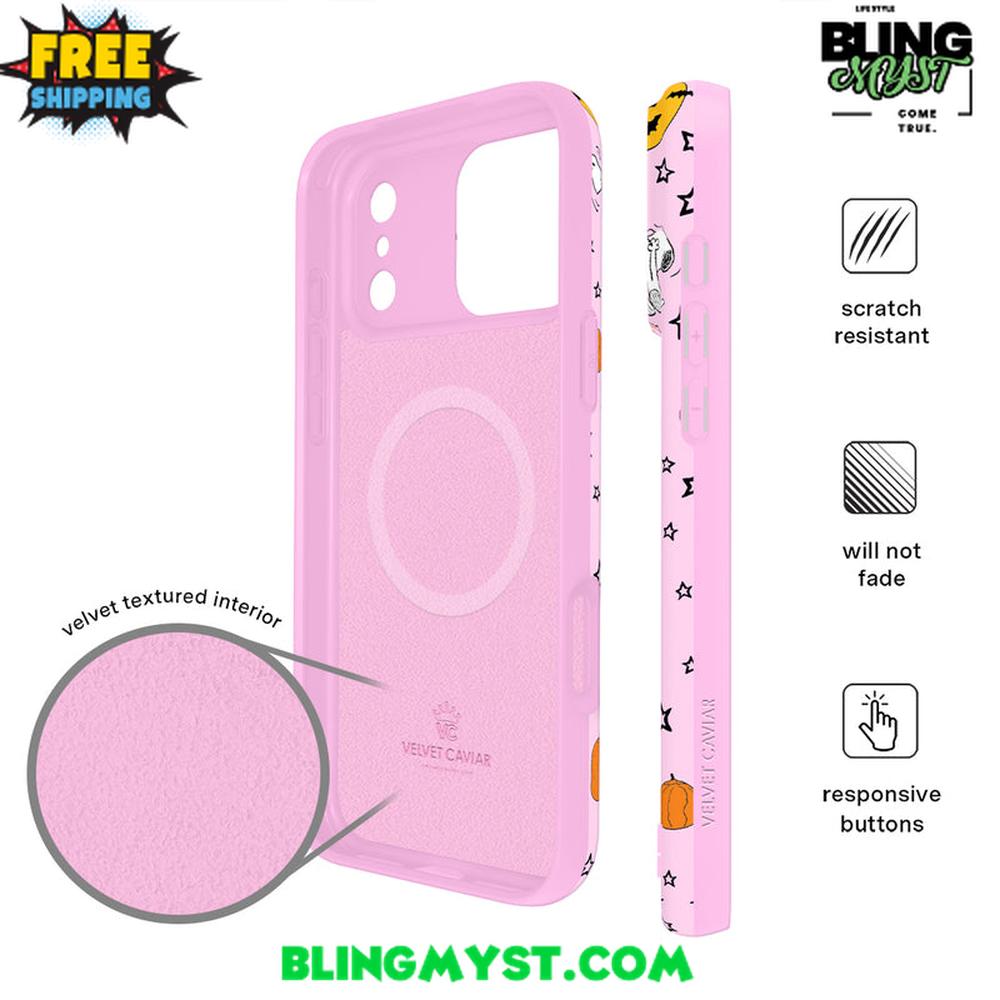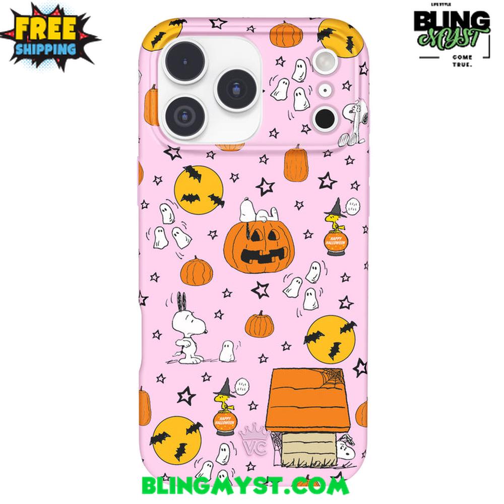 The Velvet Caviar Snoopy Pink Pumpkins Halloween iPhone Case captures the playful spirit of Halloween with a sweet pastel twist.