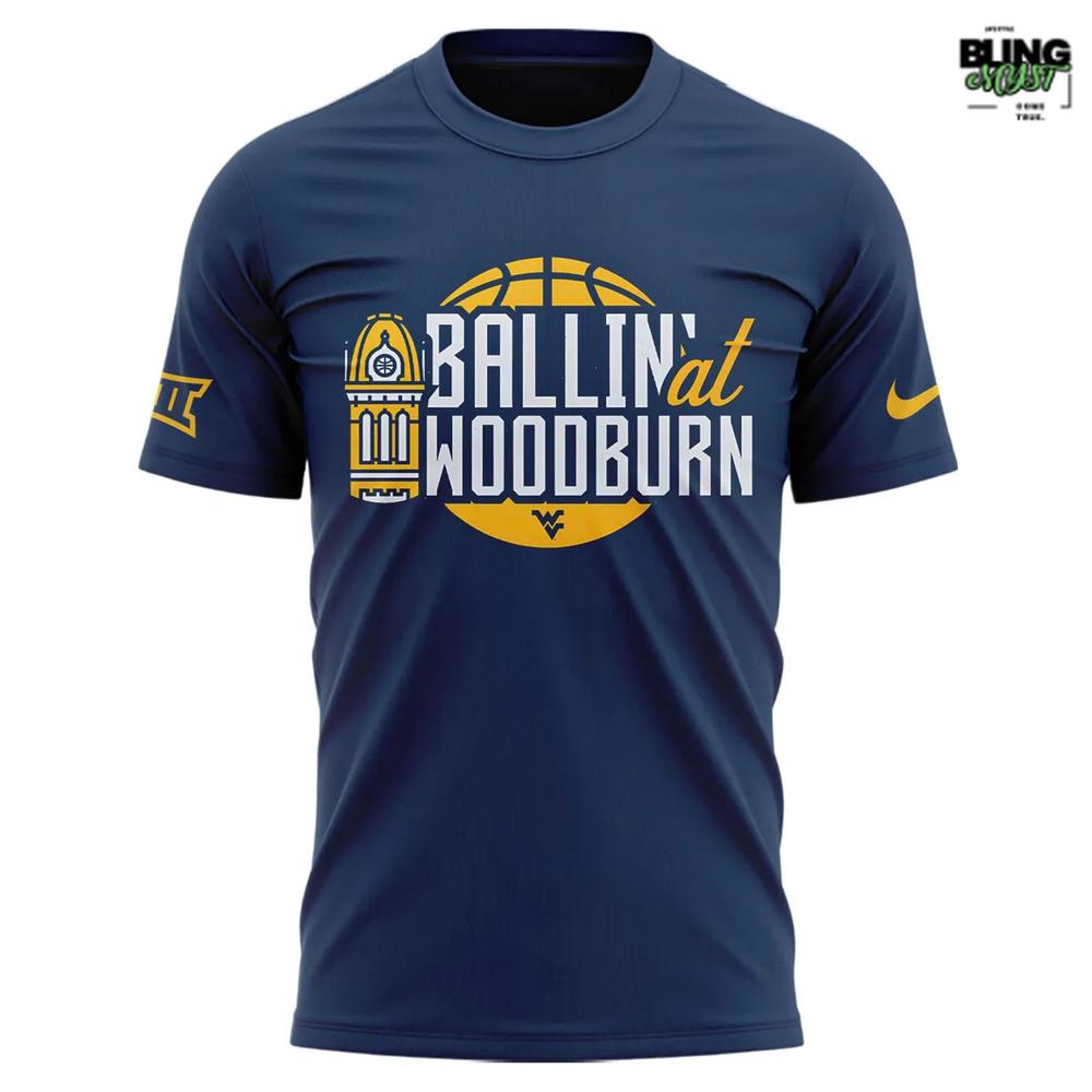 Features a bold front graphic of Woodburn Hall paired with a basketball silhouette and Ballinβ at Woodburn text for a unique WVU hoops tribute