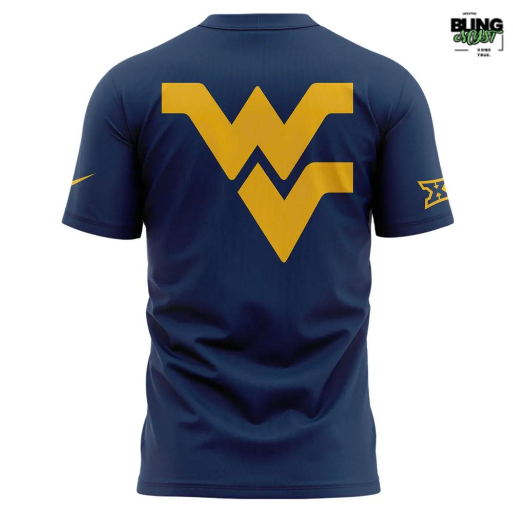Classic WVU colorsβdeep navy and goldβwith a large Flying WV logo printed across the back
