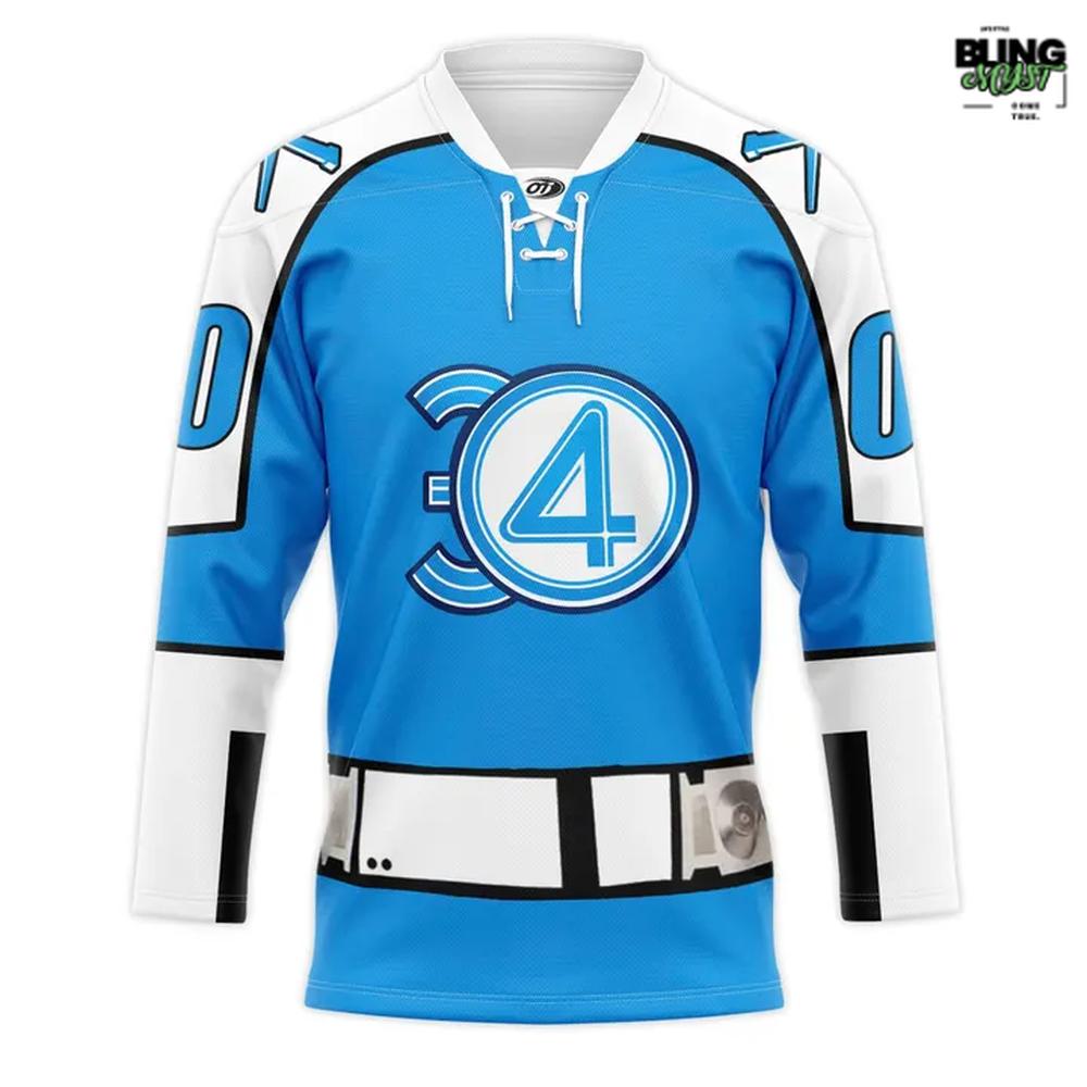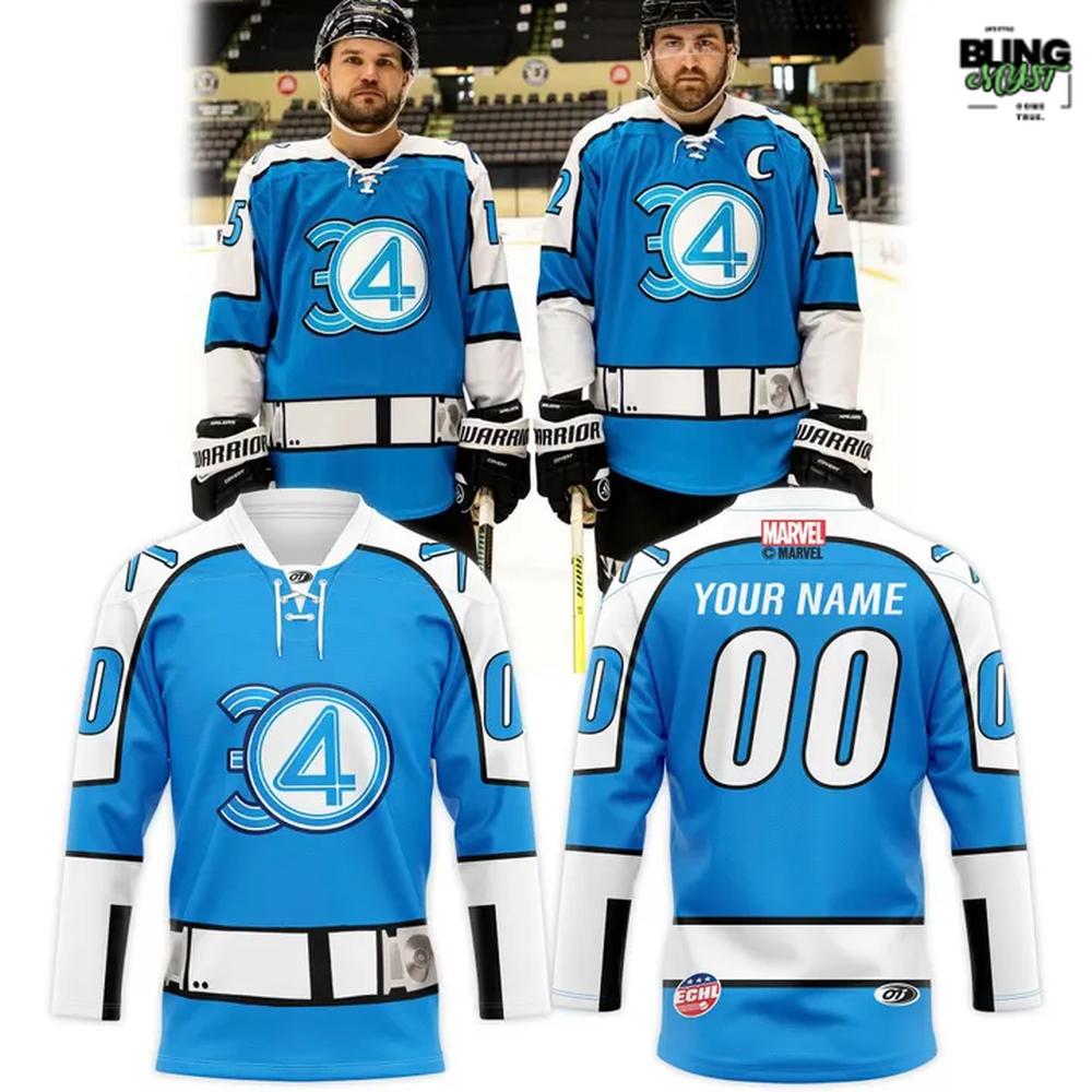 The Wheeling Nailers Marvel Super Hero Night 2026 Hockey Jersey feels like a confident crossover between arena grit and comic-book iconography—and it mostly nails the assignment. The first thing that lands is the unapologetic electric blue base, framed by white sleeves and black accents that sharpen the silhouette instead of cluttering it. Center stage is the oversized “4” emblem, bold and instantly readable from distance, giving the jersey that rare quality of being both team-wear and statement piece.
