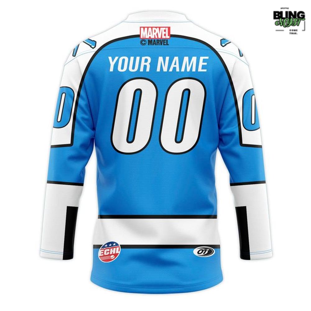 On the back, the custom name/number panel is the real fan-service win: it turns a themed night jersey into something personal, collectible, and genuinely display-worthy. If there’s a critique, it’s that the branding and theme are so dominant that it may feel less “everyday team jersey” and more event-exclusive—but that’s also the point. Overall, it’s a strong piece of fan identity: bold, legible, and built to celebrate both hockey culture and Marvel-scale fandom.